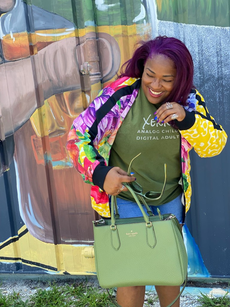 I am Regina Lynette. I love myself when I’m being the most. Like when I wear all the colors, and dye my hair purple, and wear purple nails, and wear all my rings at the same time, and wear a graphic tee with an identity statement, and choose green because it enhances creativity, and stand beside a giant mural of a mason jar of sweet tea.